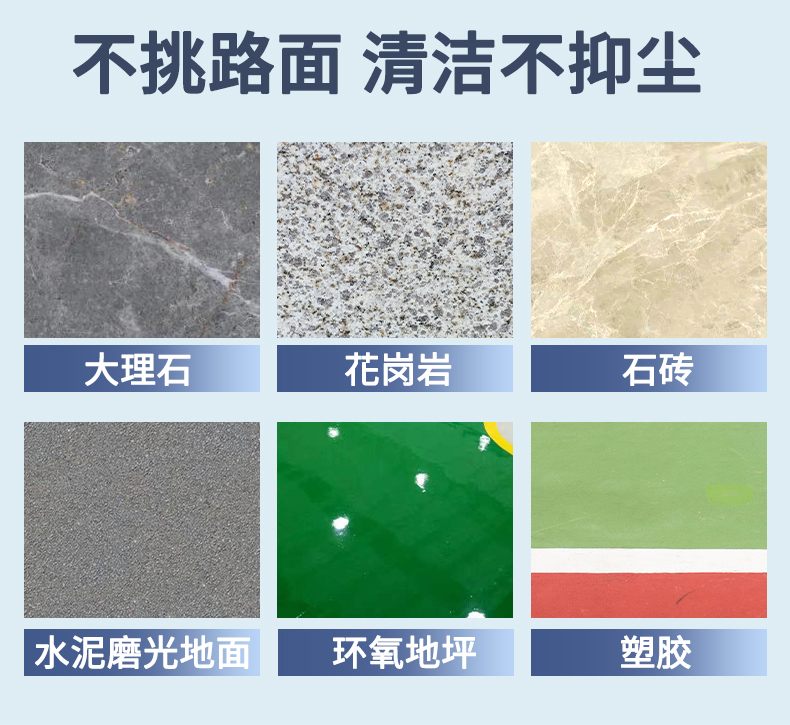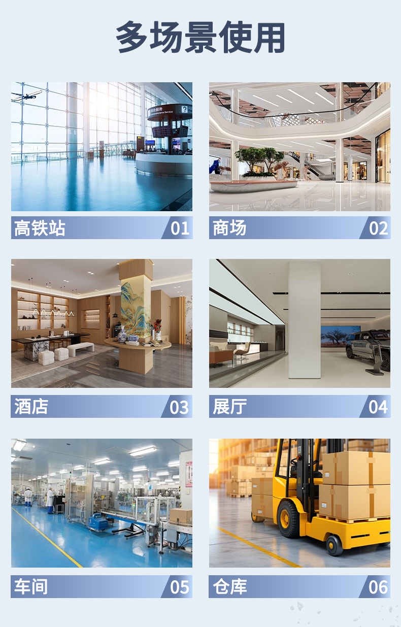 适用场所:车间、物流中心、超市、酒店、高铁站、展馆等大型场所的硬地面保洁与保养。如:环氧树脂地面、大理石地面、抛光砖地面、水磨石地面等。