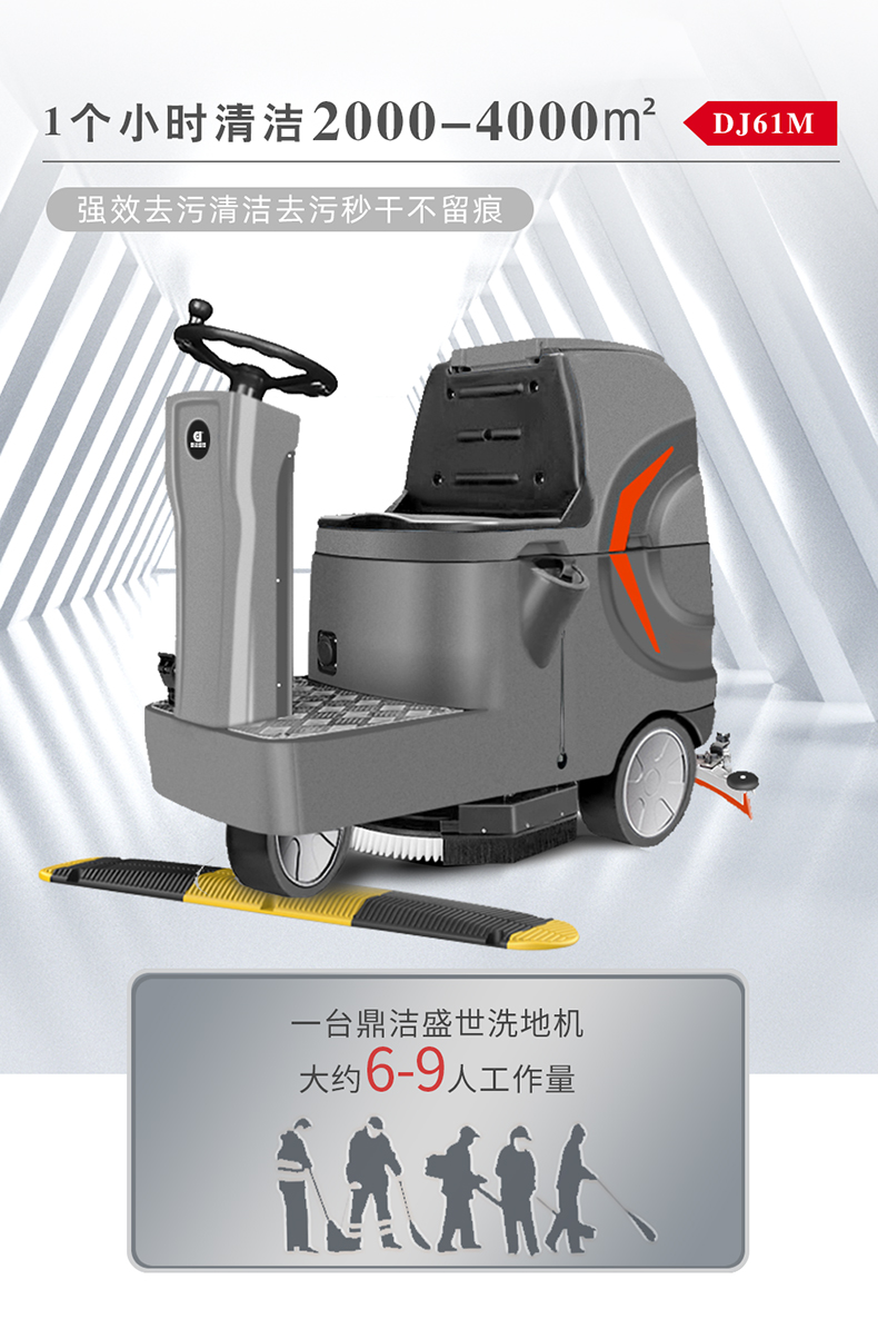 驾驶式洗地机怎么选择?1 清洁效率:优先选择每小时清洁面积&ge;2000㎡、续航&ge;4小时的机型,如鼎洁盛世DJ530M(2700㎡ h,续航5小时)。