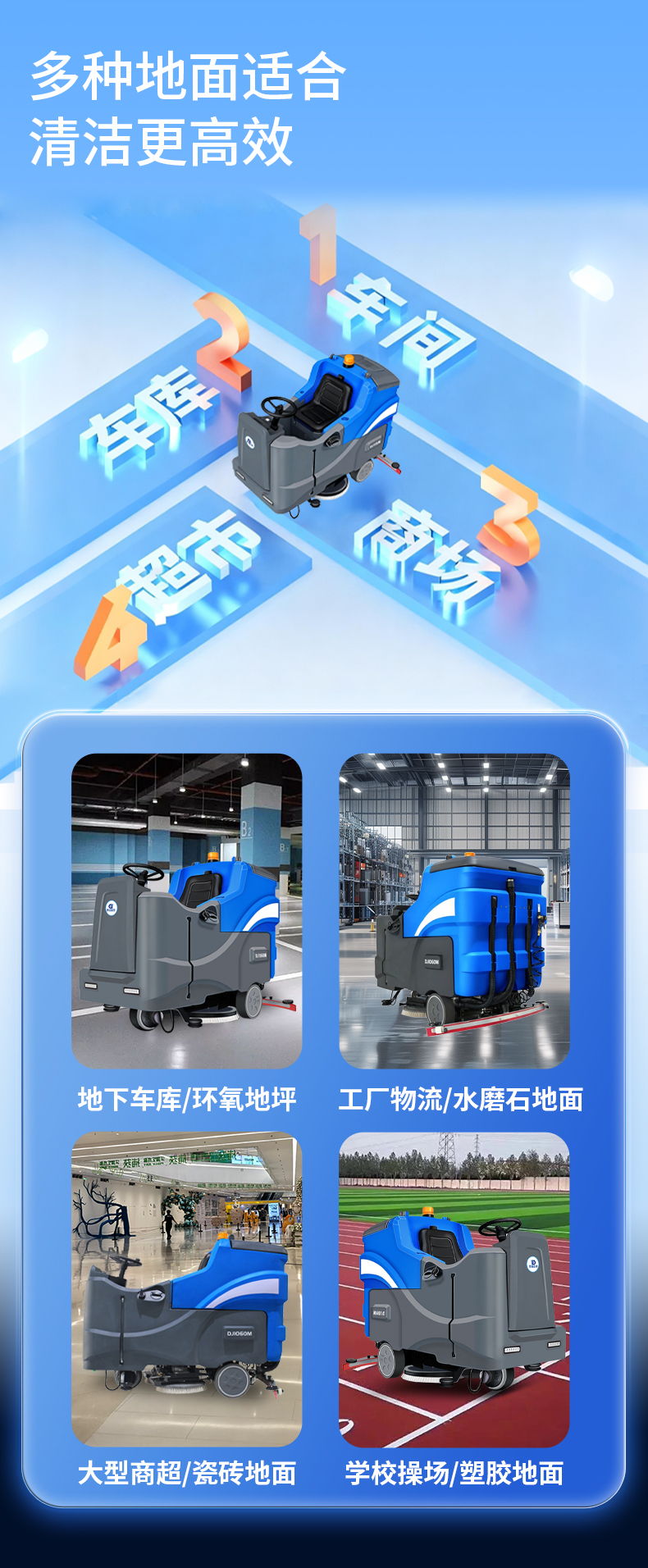 适用场所:地下车库、工厂车间、商场超市、加油站、学校酒店、火车汽车站,解决PVC、塑胶、水泥、环氧地坪、大理石瓷砖、小方砖、金刚砂等地面清洗.