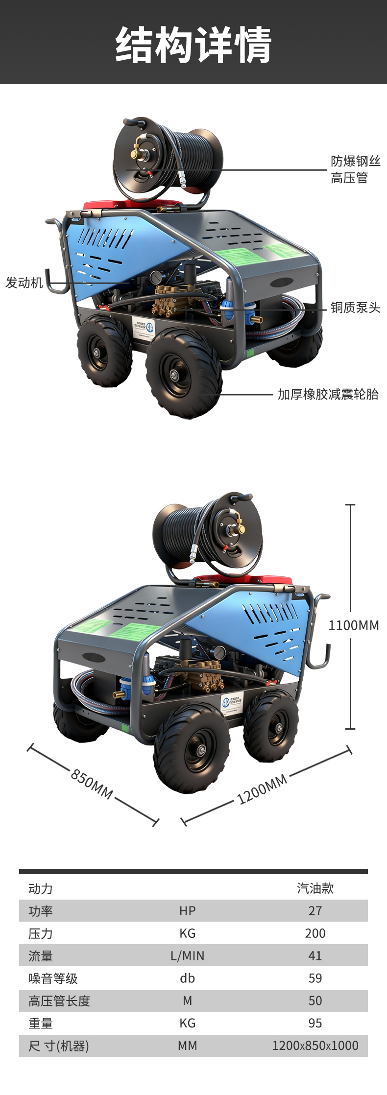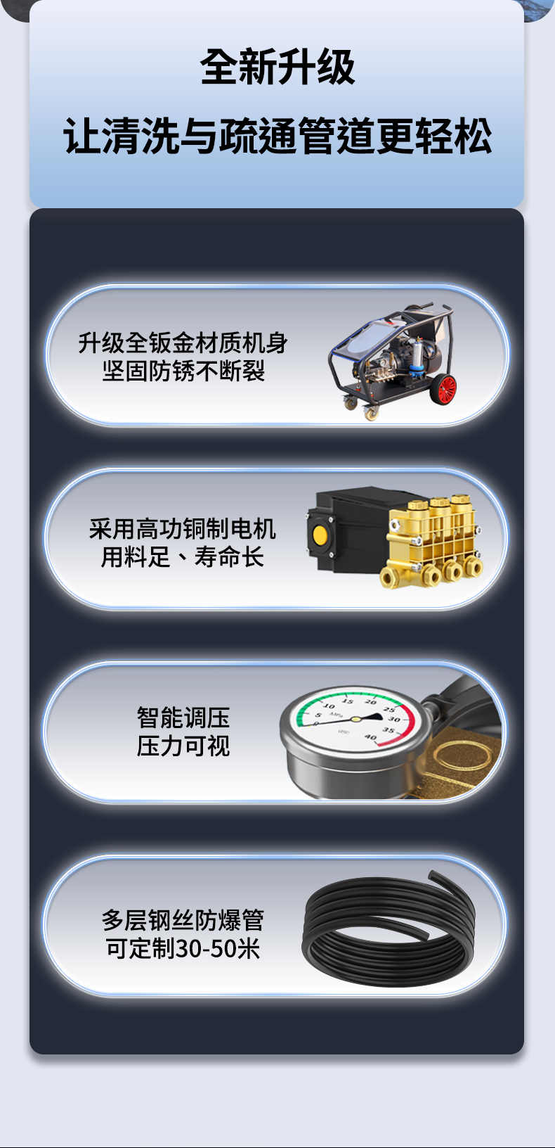 高压力,大流量,高效疏通,带关枪延时停机,过载保护,缺项保护功能